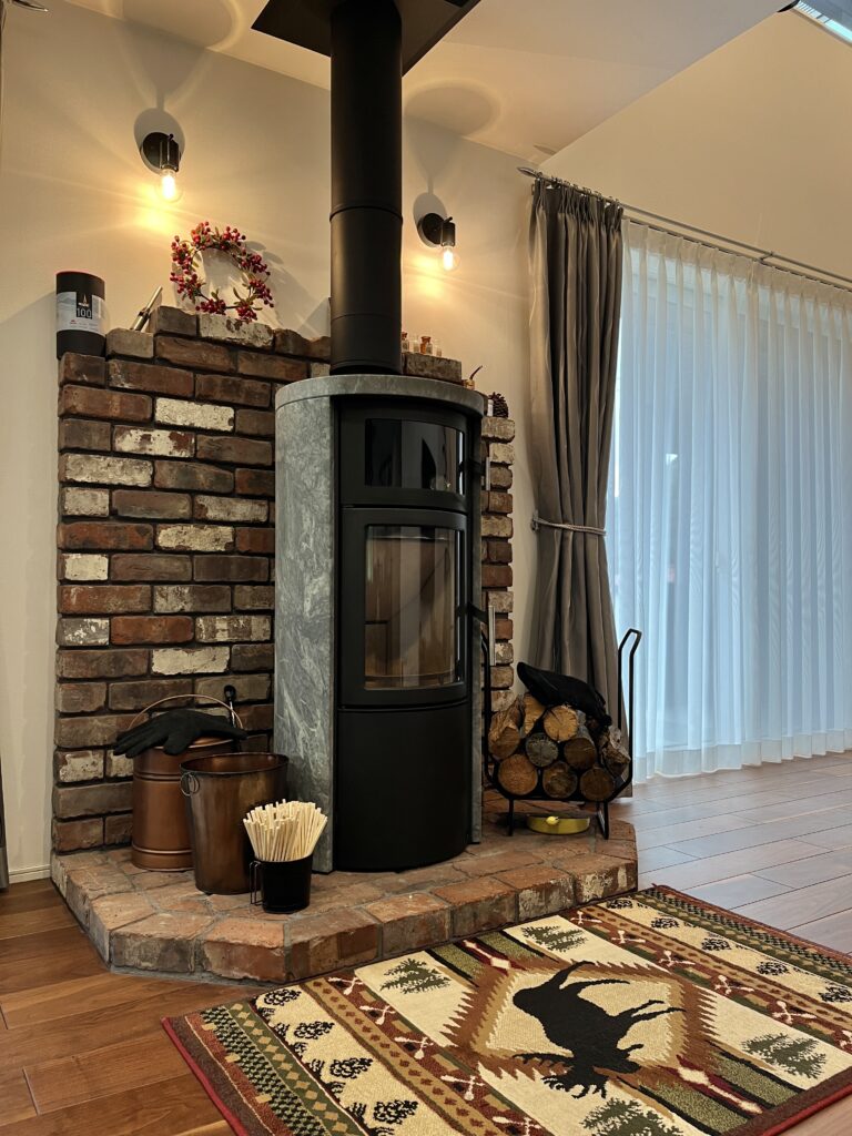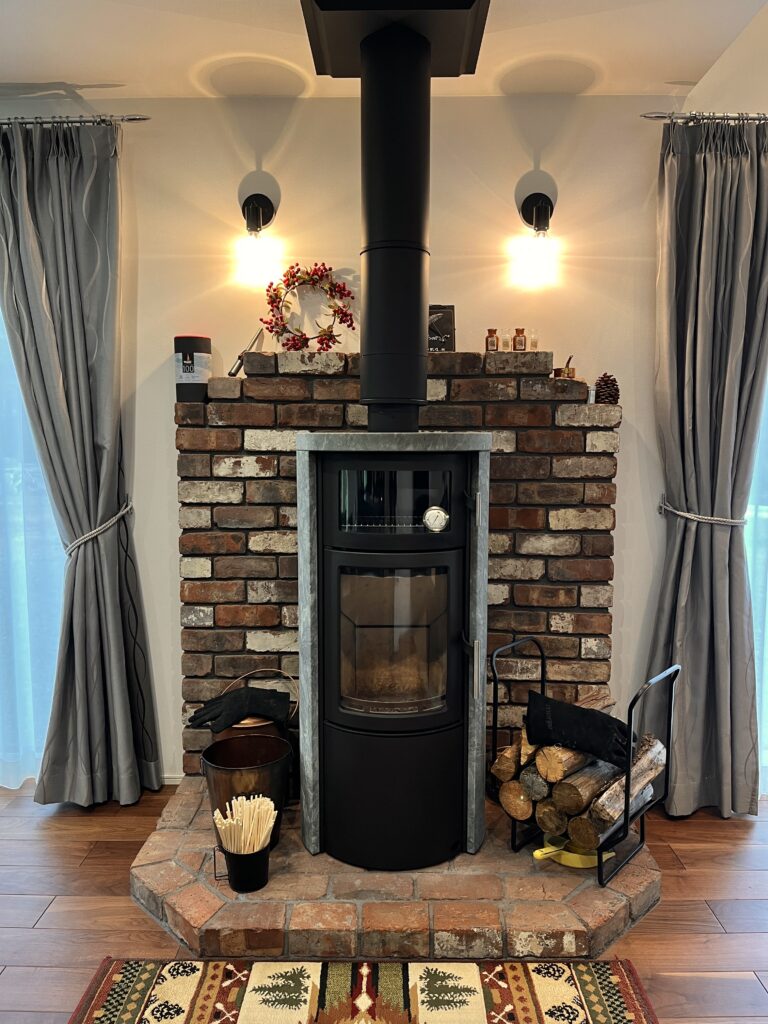 ご自身で組んだレンガの炉台炉壁もお家の雰囲気とマッチしていて