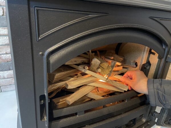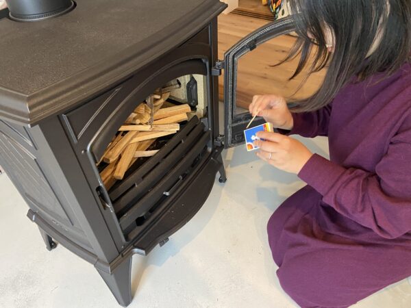 ストーブの使い方、薪の組み方、着火の仕方を一通りご説明。