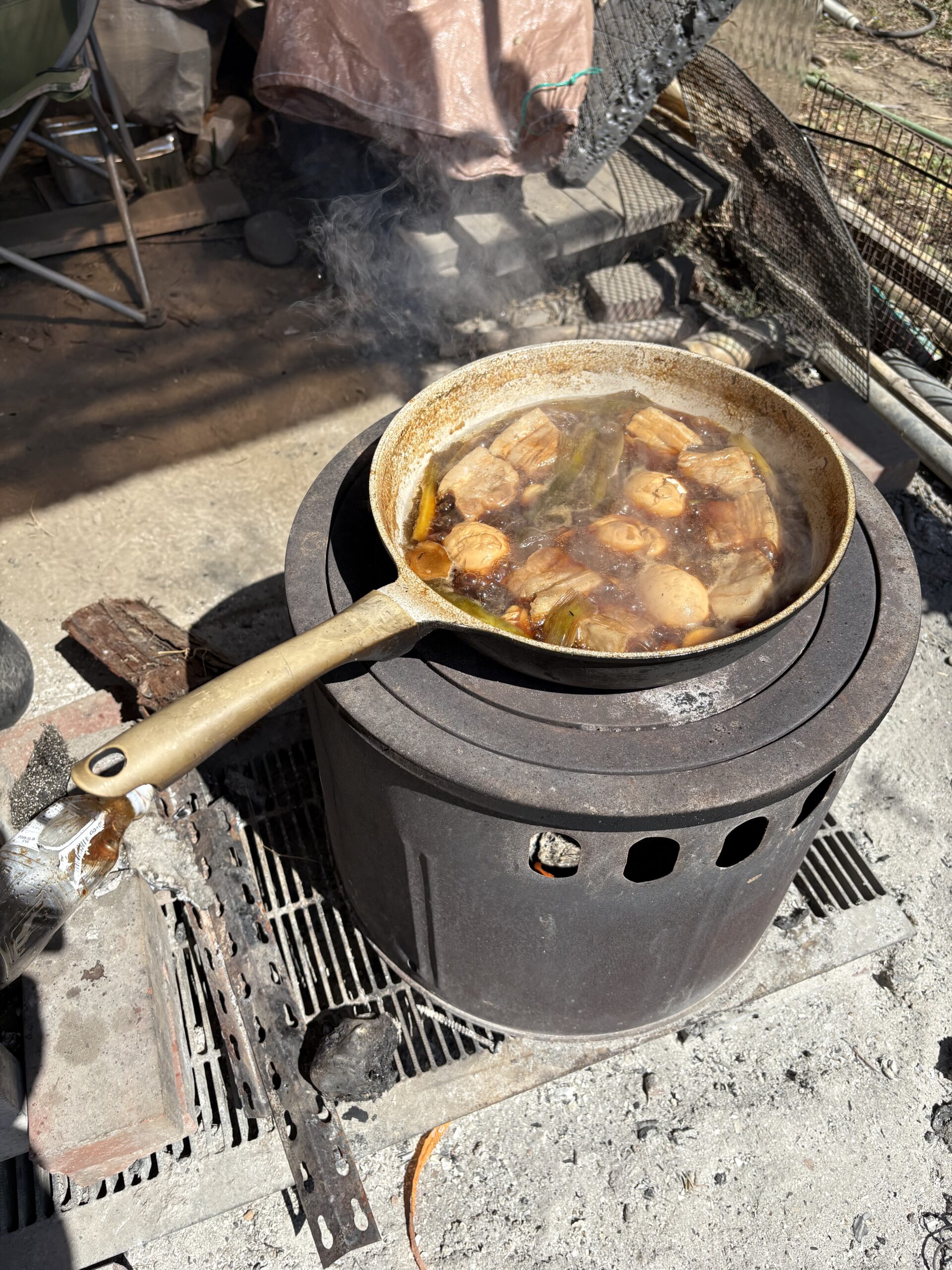 工事の日は家の外で火を焚きながら料理をしていたり、